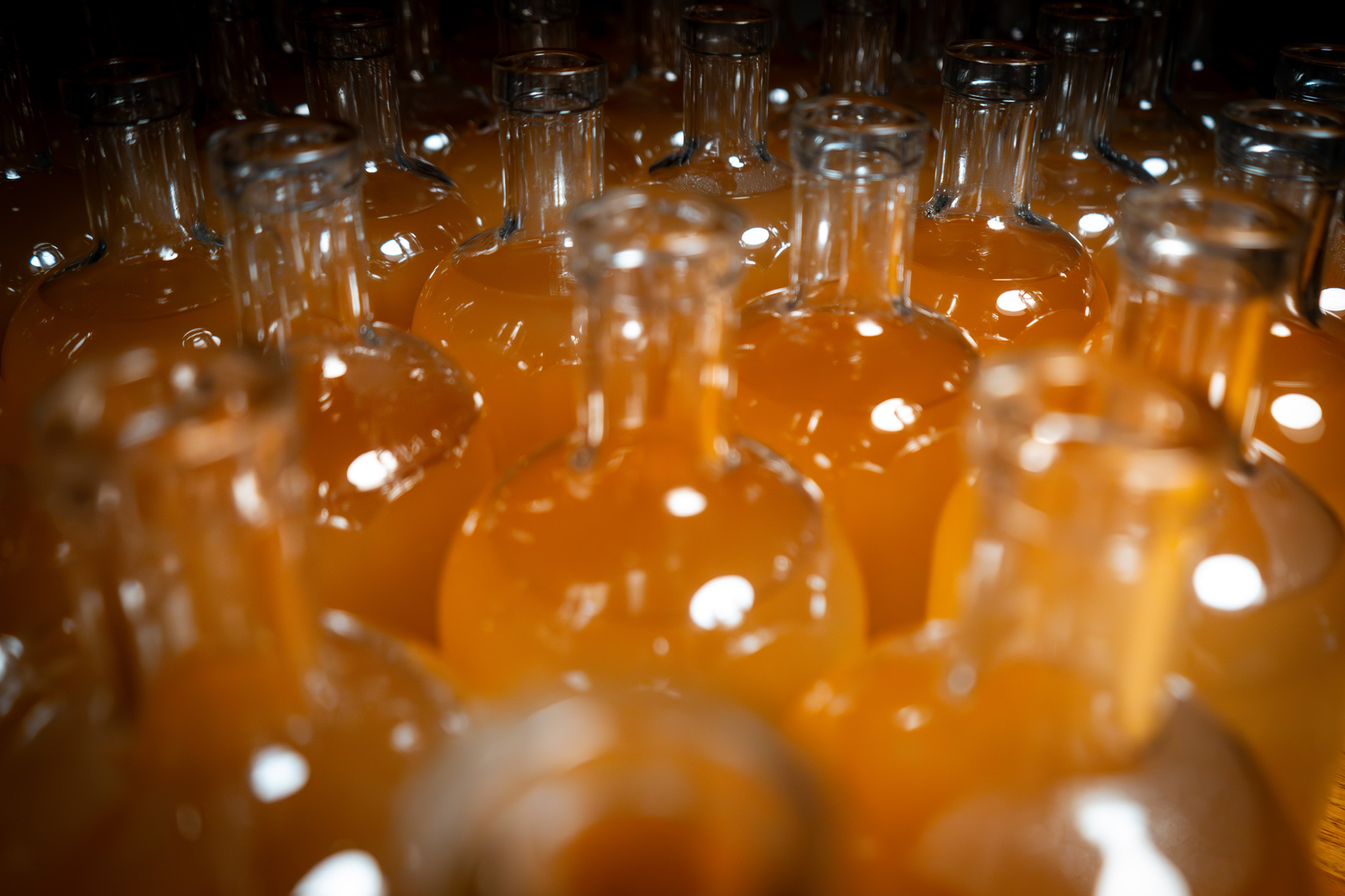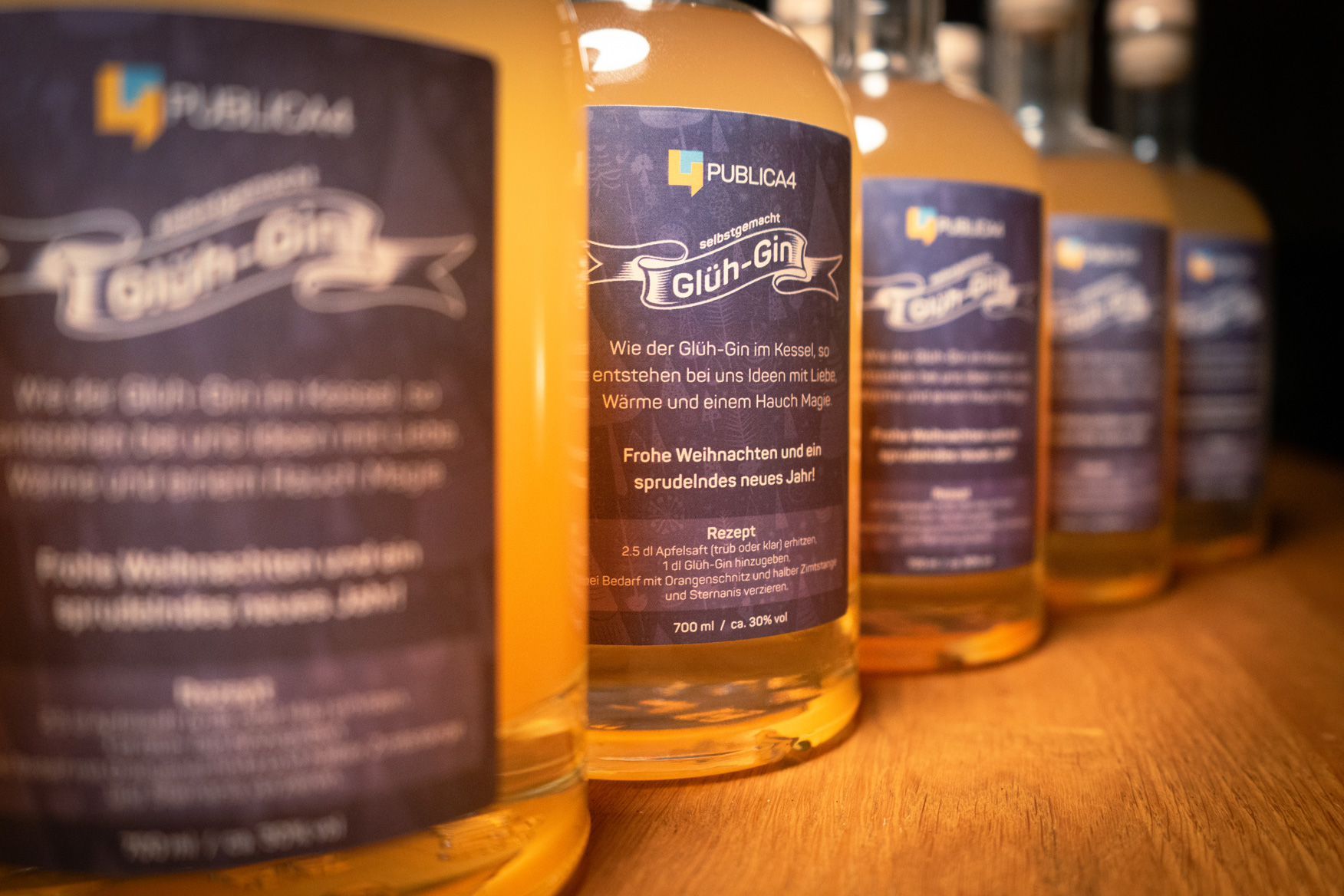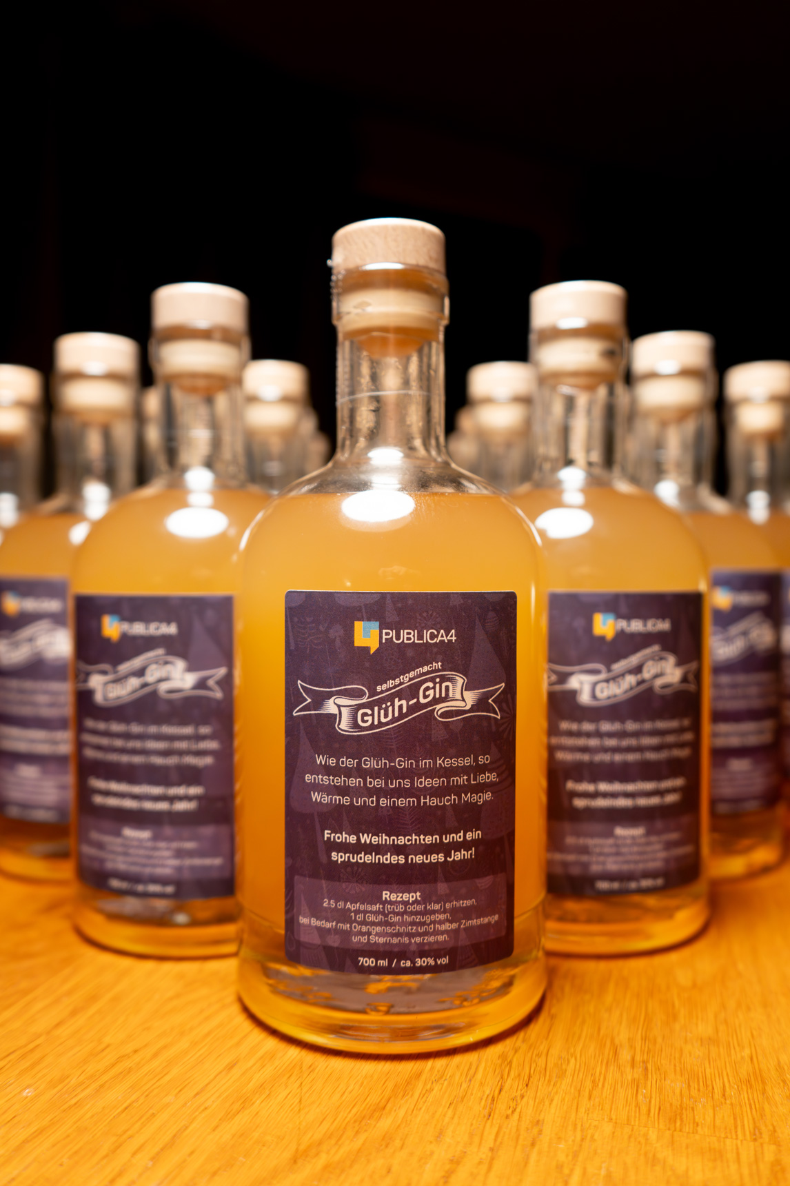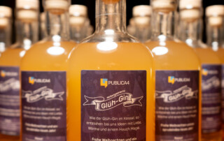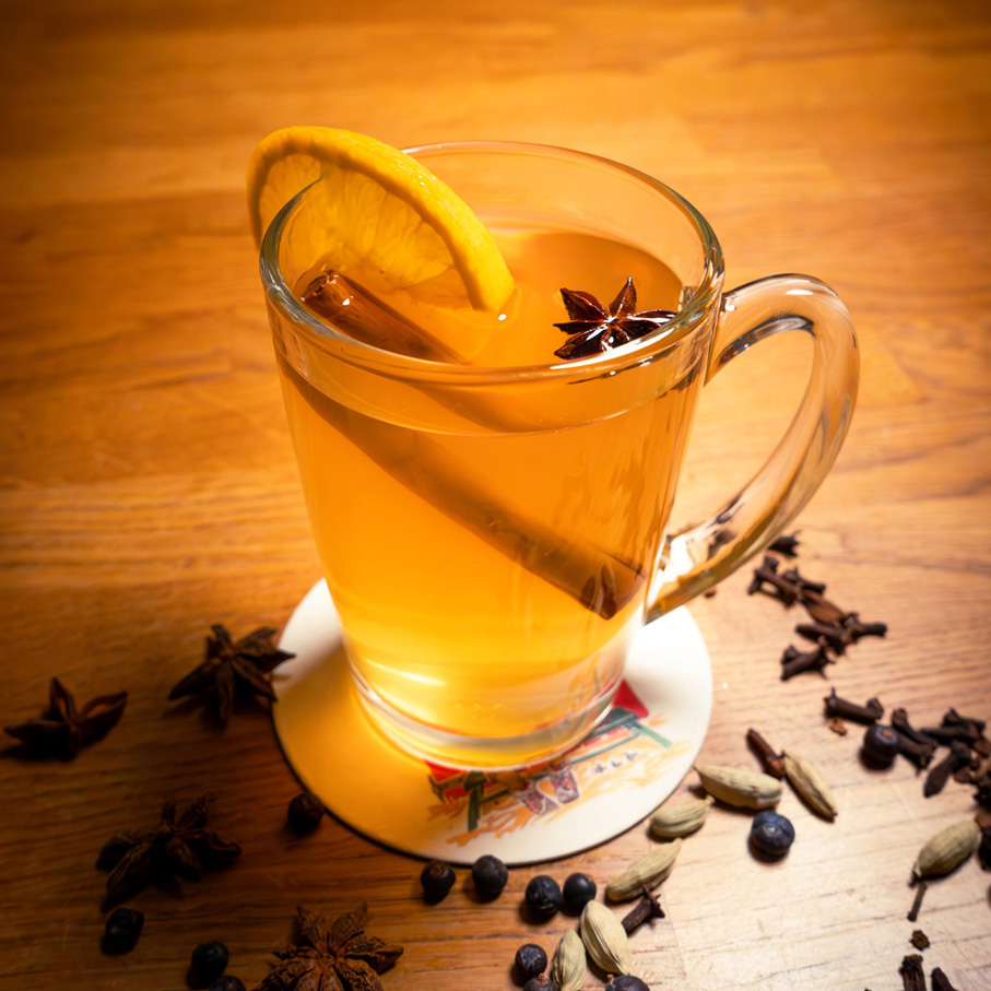 Leicht abkühlen lassen, dann kommt der erlesene Gin ins Spiel! Mit einem ausbalancierten Verhältnis von zwei Teilen Sirup zu fünf Teilen Gin entsteht unser einzigartiger Glüh-Gin (ca. 28% Alkohol). Individuelle Mischverhältnisse nach eigenem Geschmack möglich.