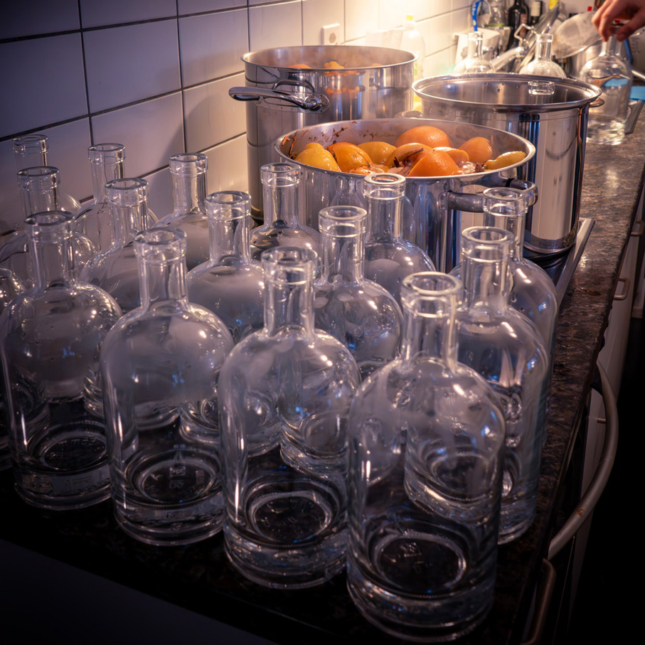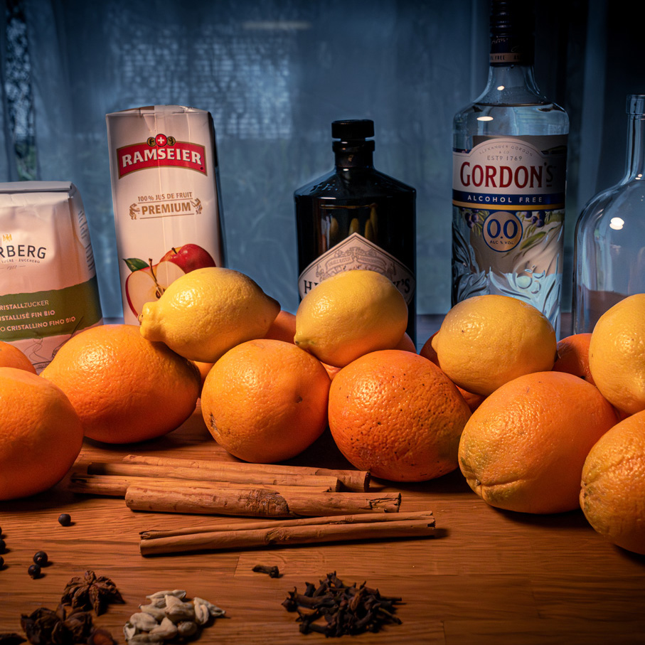 Wir beginnen mit der Auswahl erstklassiger Zutaten – von einem qualitätsvollen Gin über frische Orangen und Zitronen bis hin zu einer sorgfältig abgestimmten Mischung von winterlichen Gewürzen.